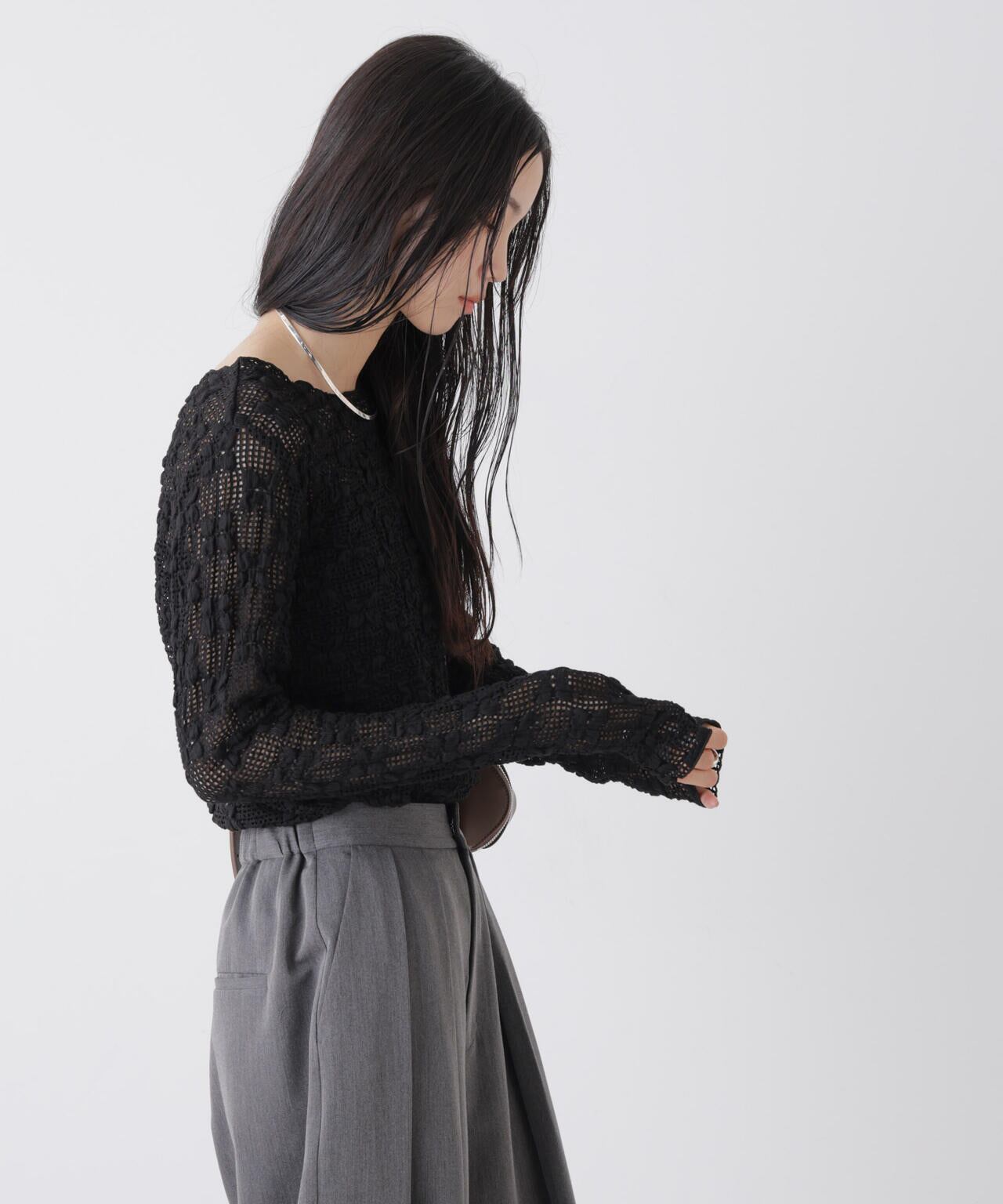 この商品は、大変デリケートな素材を使用しております。下記の点に充分ご注意の上、お取扱い下さい。素材特性上、非常にデリケートな商品ですので、着用時や着脱時に過度な力が加わりますと破れてしまう恐れがありますのでご注意下さい。着用時にベルト・バッグ・アクセサリー・身の周りのとがったもの等との摩擦や、ひっかかりにご注意ください。洗濯やクリーニングの際に、ネットを使用するなど他のものとのひっかかりにご注意下さい。この商品は、ソフトな風合いのデリケートな素材を使用しております。下記の転移ご留意の上、お取扱い下さい。ご着用やクリーニングをくり返すことにより、素材の特性上、毛乱れが生じます。着用中の摩擦により、多少の毛抜けや毛羽立ちが生じ、毛羽が付着します。ご着用やクリーニング等での繰り返しの摩擦により、毛玉(ピリング)が発生します。お取扱いの際には、取扱い絵表示をご確認下さい。