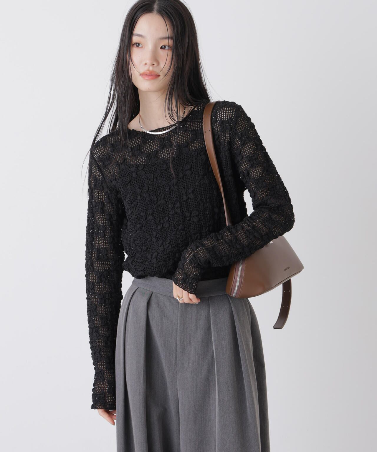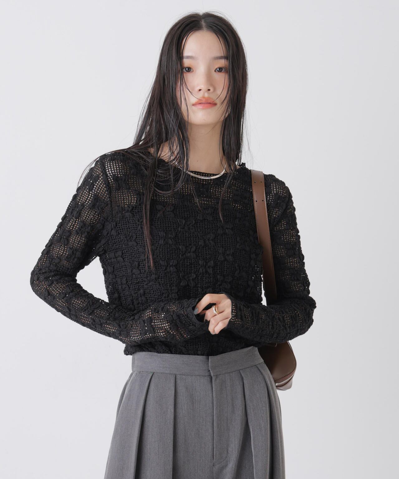 ポコポコした凹凸感のある花柄と、メッシュのレースコンビが大人可愛いカットトップス。素材に特徴があるので、キレイ目なワイドパンツやボリュームスカートに合わせたり、デニムなどのカジュアルパンツと合わせても素敵です。
