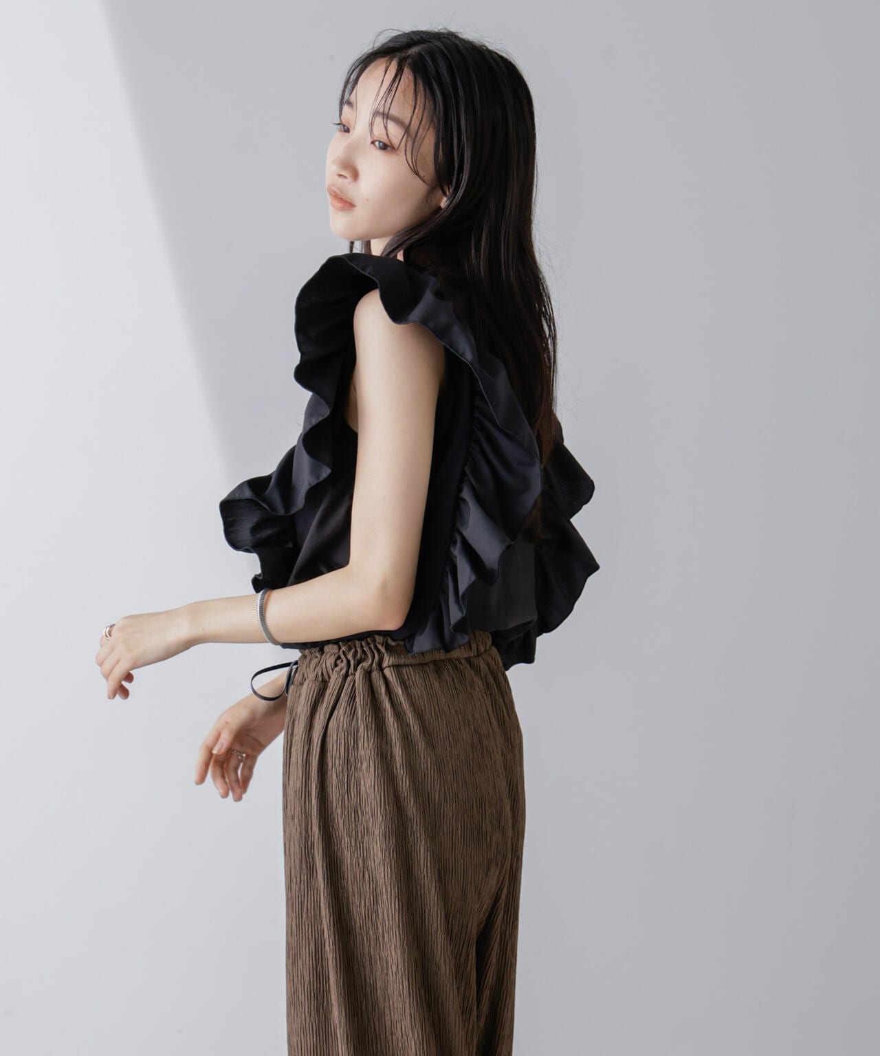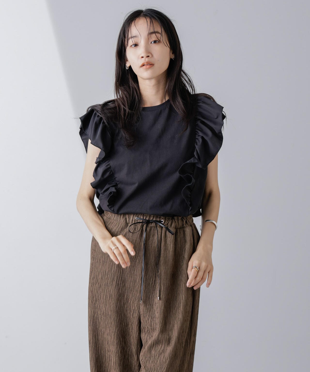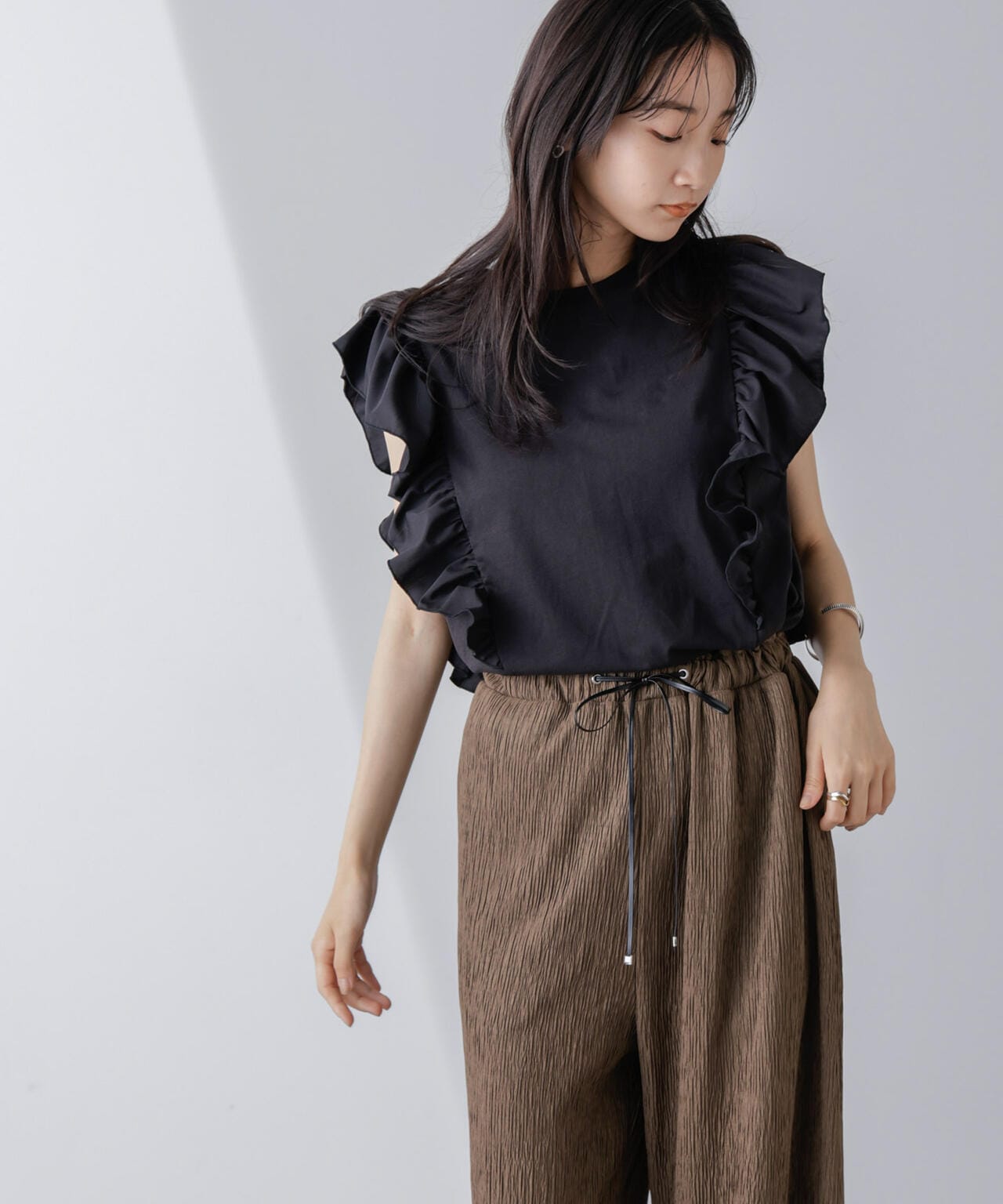 異素材コンビフリルスリーブカットトップス