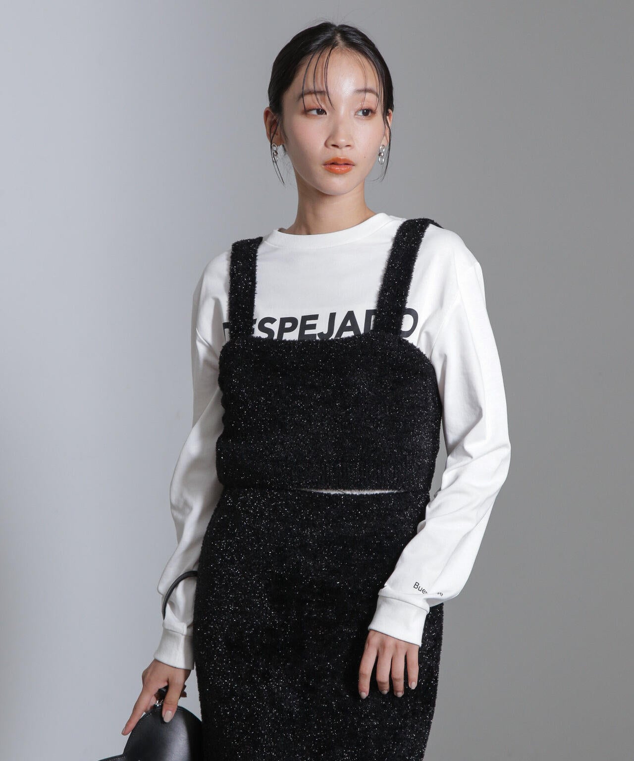 トップスやワンピースの上からレイヤードし、秋冬のコーディネートを華やかに見せてくれるラメシャギーニットビスチェ。コンパクトな見た目ながらしっかりとした伸縮性で幅広いインナーと相性良く、同素材のスカートに合わせたセットアップスタイルもおすすめです!