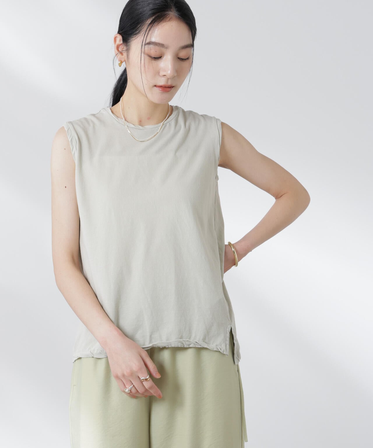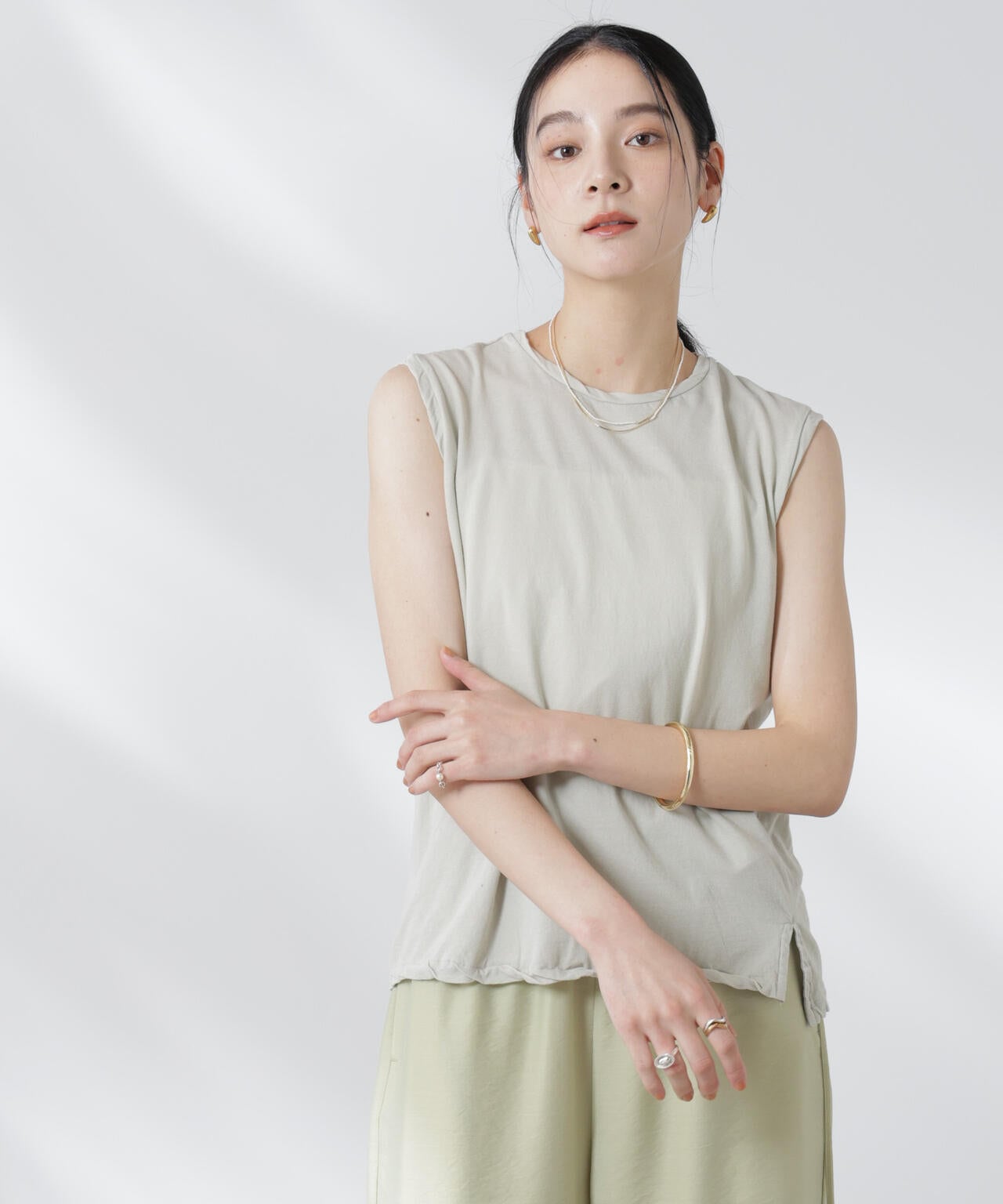 ・暑い夏には一枚でシンプルにデニムやワイドパンツと合わせたり、ジレやジャケットのインナーとしてもおすすめの一着